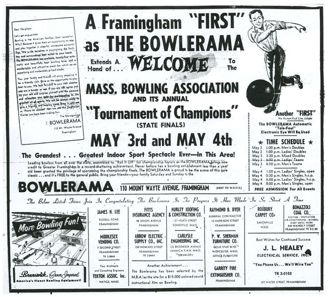 May 1958 was the opening of the Bowlerama on Mt Wayte Ave in Framingham.